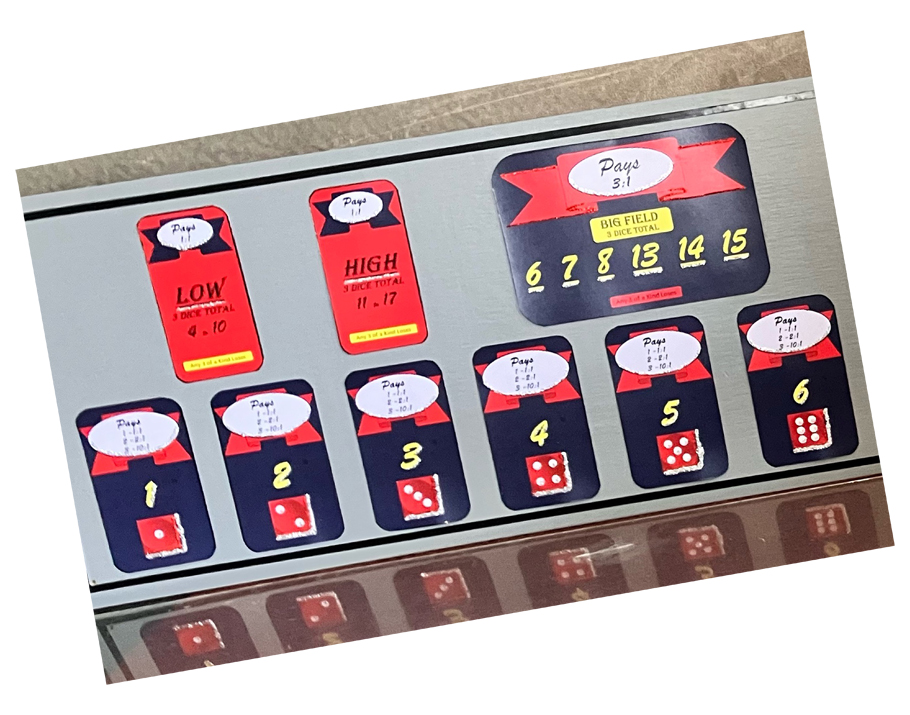 There are 3 large dice in an hour-glass shaped cage that gets spun, whatever sides of the dice come up, those sides wins So, if the dice come up as 5, 1, and 3, each of those numbers & the total 9 wins, depending on which field you bet.